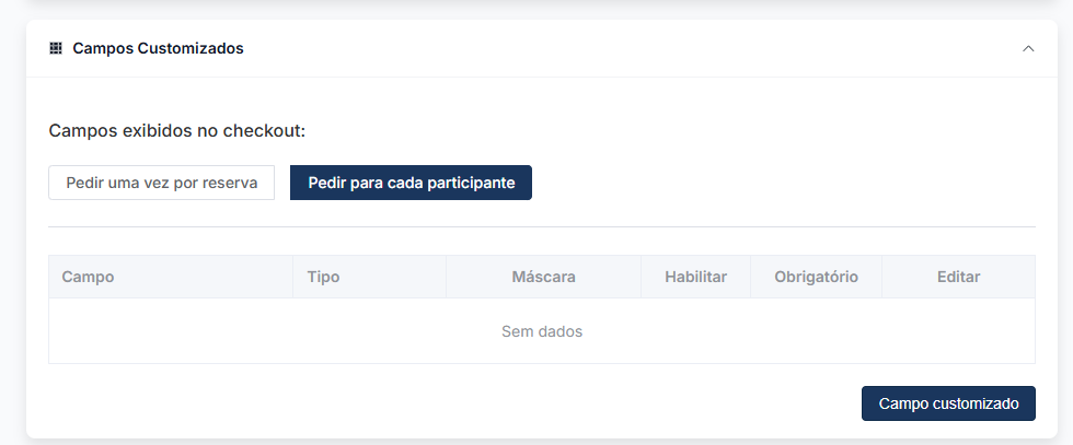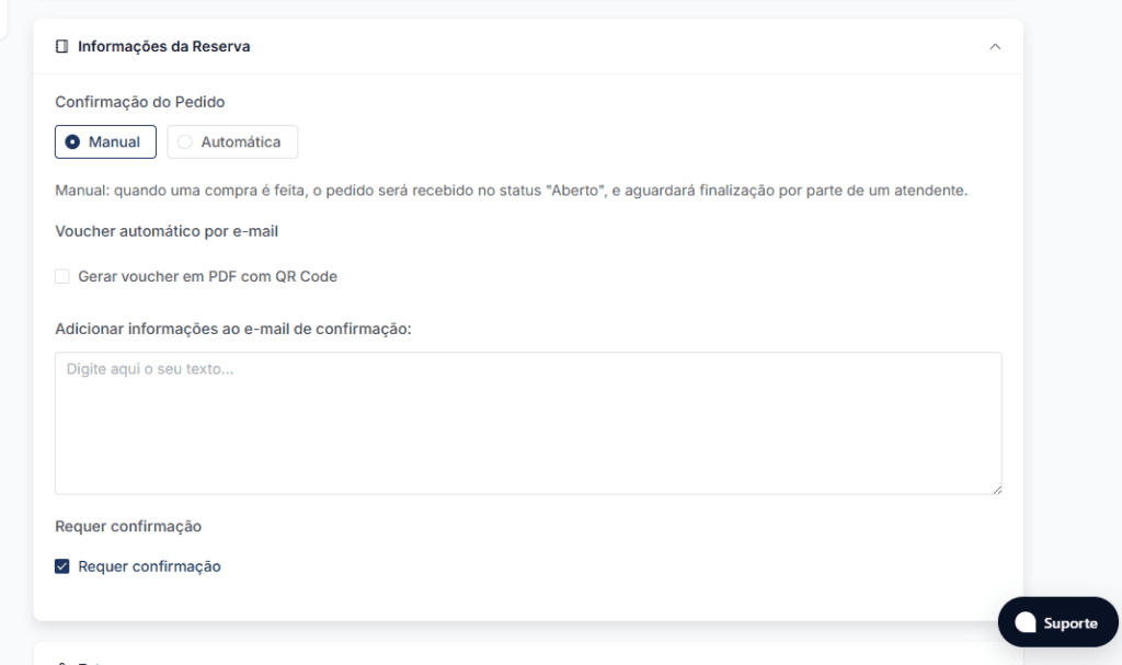 Produtos Como funciona a aba Informações da Reserva Leitura estimada: 2 minutos 591 views Resumo: Saiba como funciona a aba Informações da Reserva uma nova funcionalidade na aba de produtos da Moblix. Que tal adicionar os dados dos seus clientes no checkout dos produtos? Com a nova funcionalidade da Moblix você pode estar configurando os dados que devem ou não aparecer ao finalizar uma compra. Nesse artigo vamos te ensinar o passo a passo de como usar essa nova funcionalidade. Essa aba está disponível somente para precificação do tipo Por pessoa caso contrário a mesma não será exibida. 1- No seu painel de administração vá em Produtos –> Lista de produtos –> Produtos para adicionar um novo produto. 2- Ao escolher a precificação por pessoa basta ir para o final da página onde se encontra o campo Informações da Reserva. 3- Você pode escolher a confirmação do pedido como Manual ou Automática. 4- Você também pode estar adicionando novos campos e configurando- os no checkout. Basta clicar em Campo Customizado. 5- O novo campo configurado será adicionado no checkout do produto. Prontinho, você aprendeu como configurar as Informações de Reserva do seu produto e como essa aba funciona. Em caso de dúvidas não deixe de entrar em contato com nosso suporte Para mais artigos como esse acesse nossa Central de Atendimento. Marcado:Cadastrar ProdutosInformações da ReservaPlataforma MoblixProdutos