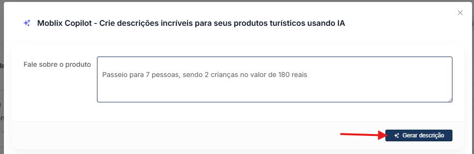 Produtos Como usar o ChatGPT nos seus produtos Leitura estimada: 2 minutos 703 views Resumo: Saiba como usar o ChatGPT nos seus produtos e gastar menos tempo com edição e descrições. Uma das atividades que mais consomem tempo das Agências de Viagens é preparar a OTA para o lançamento. E um dos fatores mais importantes para o sucesso inicial de uma OTA está em páginas e descrições de produtos bem elaboradas. Agora ficou muito mais fácil criar produtos dentro do seu painel de administração. Vamos aos passos! 1- No seu Painel de administração clique em PRODUTOS –> LISTA DE PRODUTOS –> PRODUTO 2- Clique em ESCREVER COM IA. 3- Basta dar alguns detalhes sobre o seu produto para que o texto seja criado, clique em GERAR TEXTO e aguarde. 4- Assim que o texto for criado você pode clicar em: usar texto: para adicionar o texto criado no campo; Novo prompt : para gerar um novo campo de edição; Resposta mais curta: para gerar um texto menor; Resposta mais longa: para gerar um texto maior. Prontinho. Agora é só salvar e vamos as vendas! 🙂 Você também pode usar o mesmo para a criação de um roteiro. Para mais artigos como esse acesse nossa Central de Atendimento. Em caso de dúvidas não deixe de entrar em contato com nosso suporte. Marcado:Chat GPTIAPlataforma MoblixProdutos